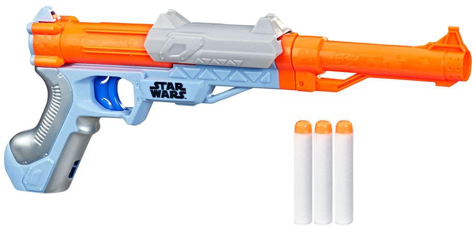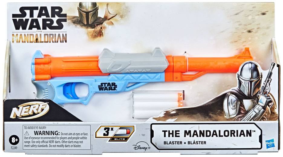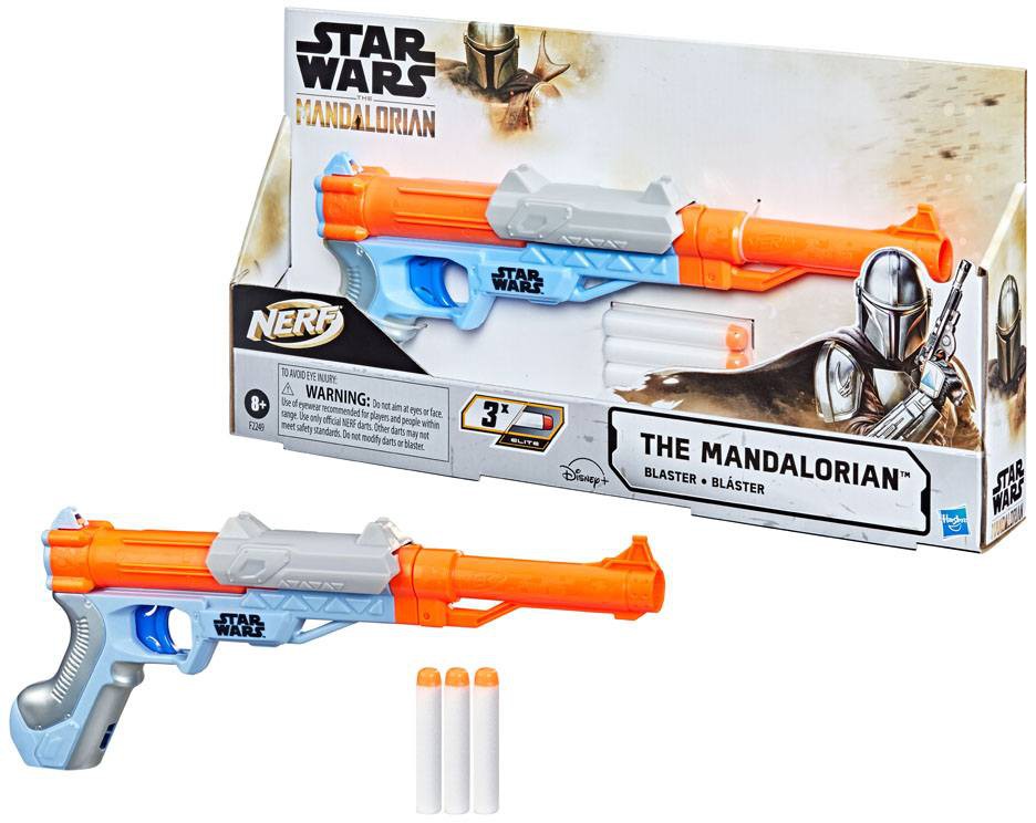 The Mandalorian is battle-worn and tight-lipped, a formidable bounty hunter in an increasingly dangerous galaxy! Imagine gearing up for action like the Mandalorian with this dart-firing Nerf Star Wars blaster that's inspired by blasters seen in The Mandalorian live-action TV series on Disney Plus. It's easy to use -- pull the slide back to open the breech, load 1 dart inside, and push the slide forward to prime the blaster. Take aim and press the trigger to fire. This Nerf blaster comes with 3 Official Nerf Elite foam darts that are tested and approved for performance and quality. It's great for indoor and outdoor play and is a perfect gift for Star Wars fans and Nerf battlers. Imagine yourself in exciting Star Wars adventures and gear up for Nerf games with this Nerf Star Wars toy blaster. Eyewear recommended (not included) No batteries required.