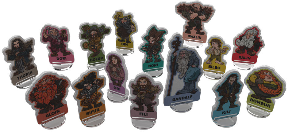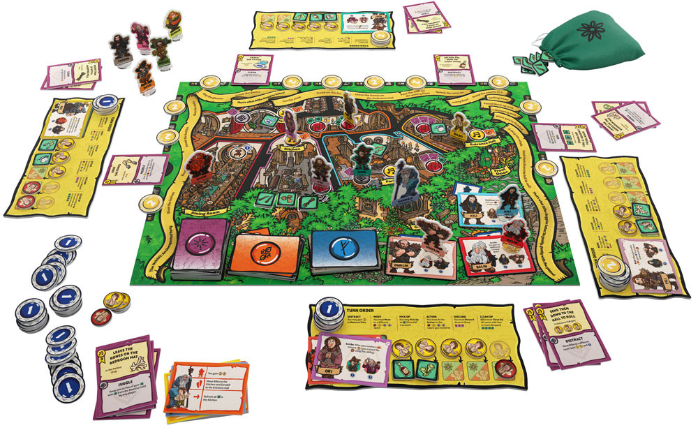 An Unexpected Party is a fast, fun, action-based tabletop game for 2-4 players, set in the opening scenes of The Hobbit: An Unexpected Journey when the thirteen Dwarves arrive unannounced at Bag End, much to Bilbo's dismay! Step into the Dwarves shoes and earn points by performing lines of the song, "The Things Bilbo Hates." As you move around Bag End you will sing loudly, gather items and generally make a mess of the place. While Bilbo might be curious about the antics of his uninvited guests at first, be careful not to push the poor hobbit too far or you will be sitting in the Dining Hall with no dinner! The game ends either when all 15 lines of the song are completed, or with the momentous arrival of Thorin. The player with the most points, who did the best job arousing Bilbo's curiosity and shaking up his sheltered life, will win!