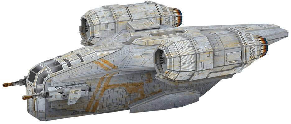 A former military craft used to patrol local territories in the time before the Empire, the Razor Crest serves as the trusty transport and living quarters for the Mandalorian and the Child, as they travel from world to world, staying out of reach of the Imperial Remnant.
