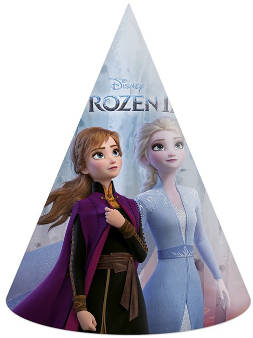 Paper party hats with Anna and Elsa from Frozen. 6-pack. Approximately 16 cm tall.