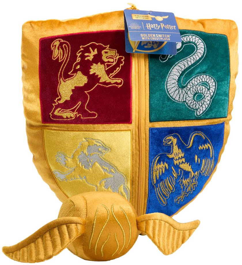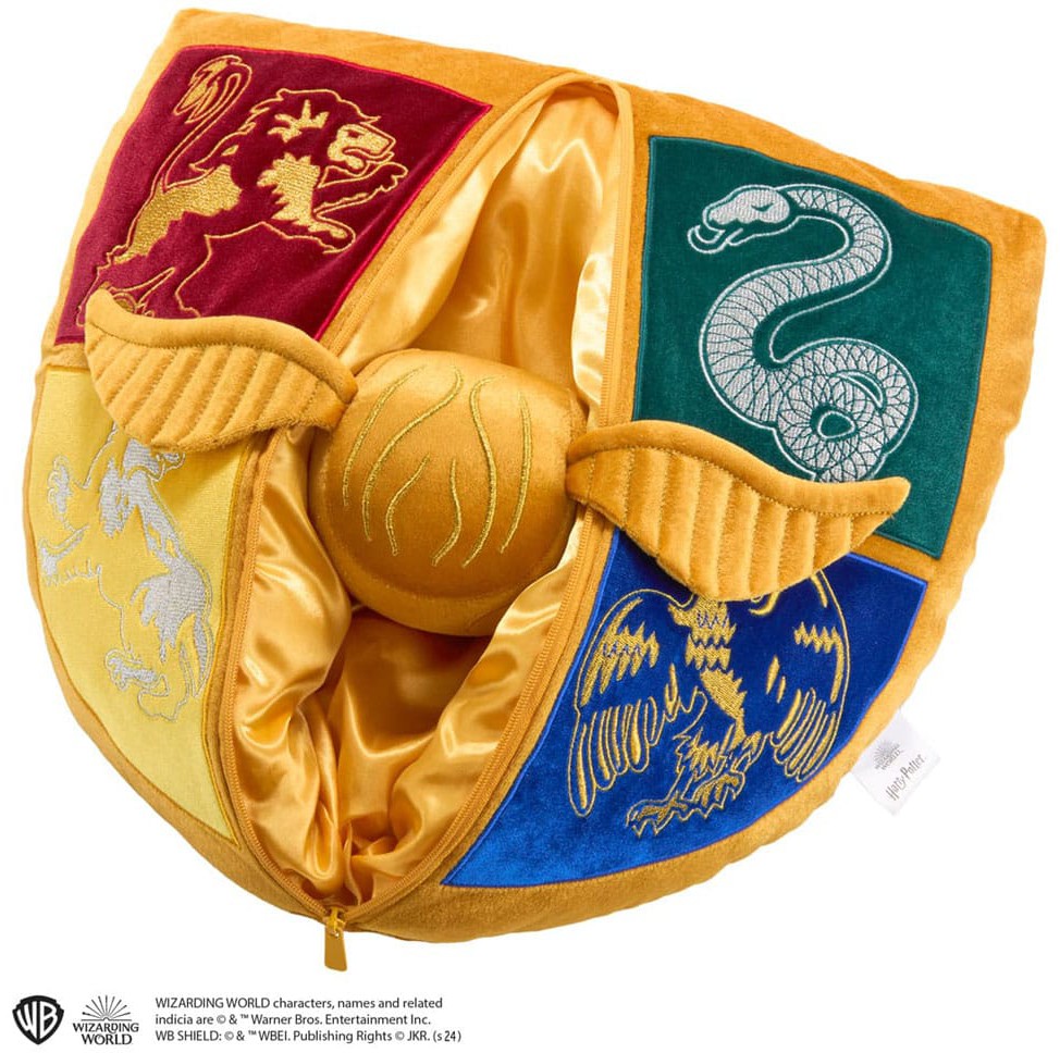 An embroidered velvet Hogwarts crest cushion, containing a removable plush version of the Golden Snitch as featured in the Harry Potter films.