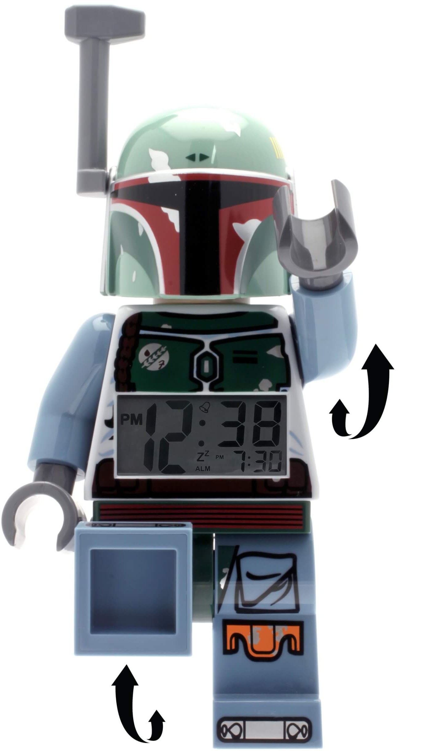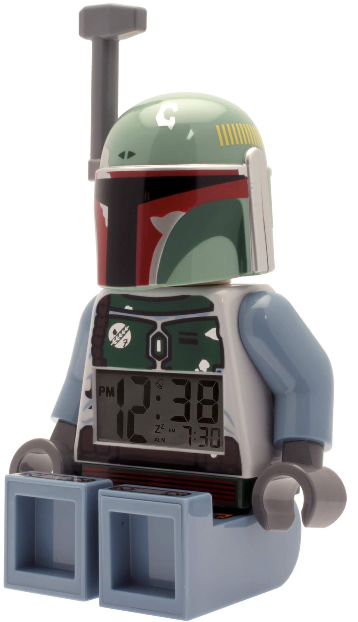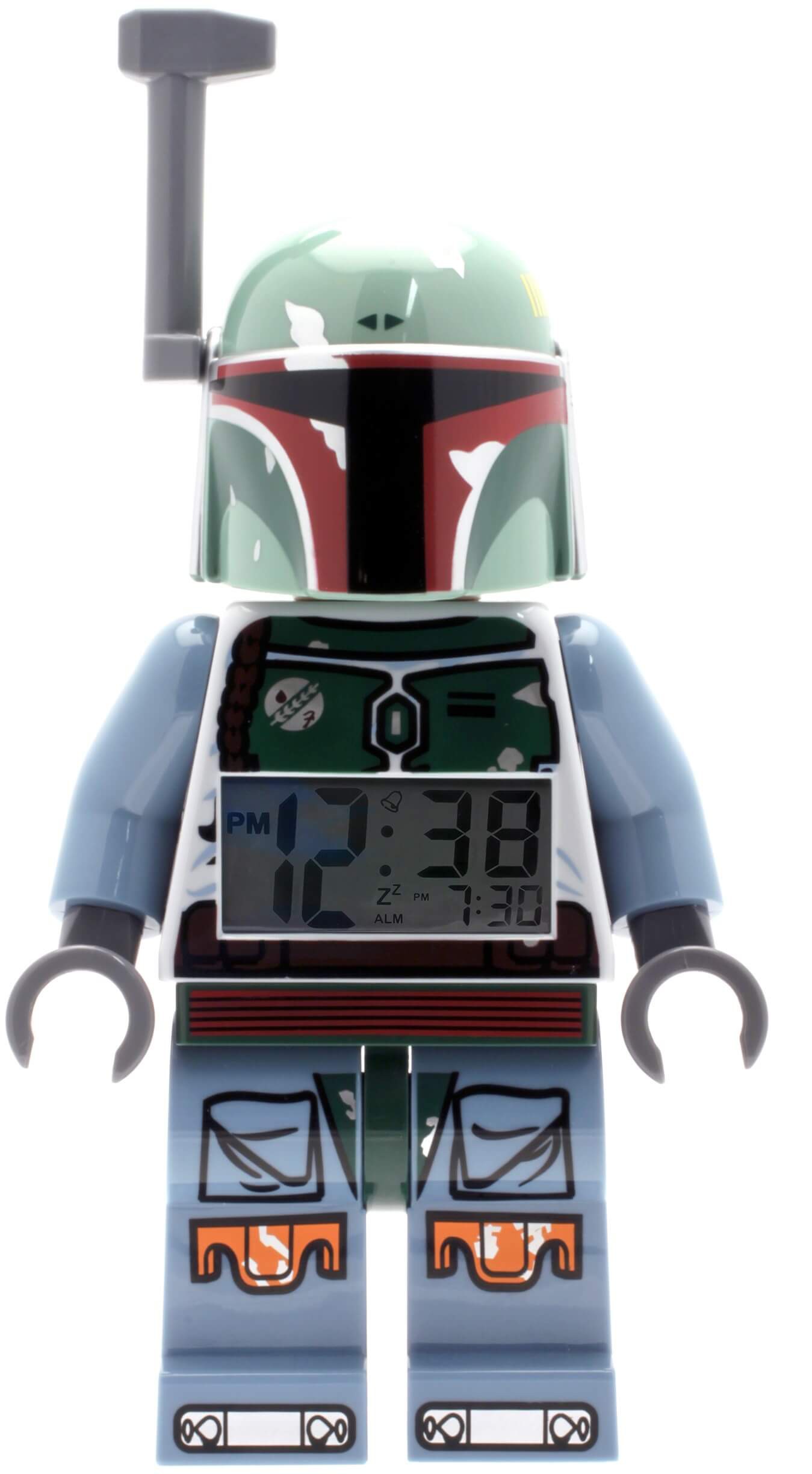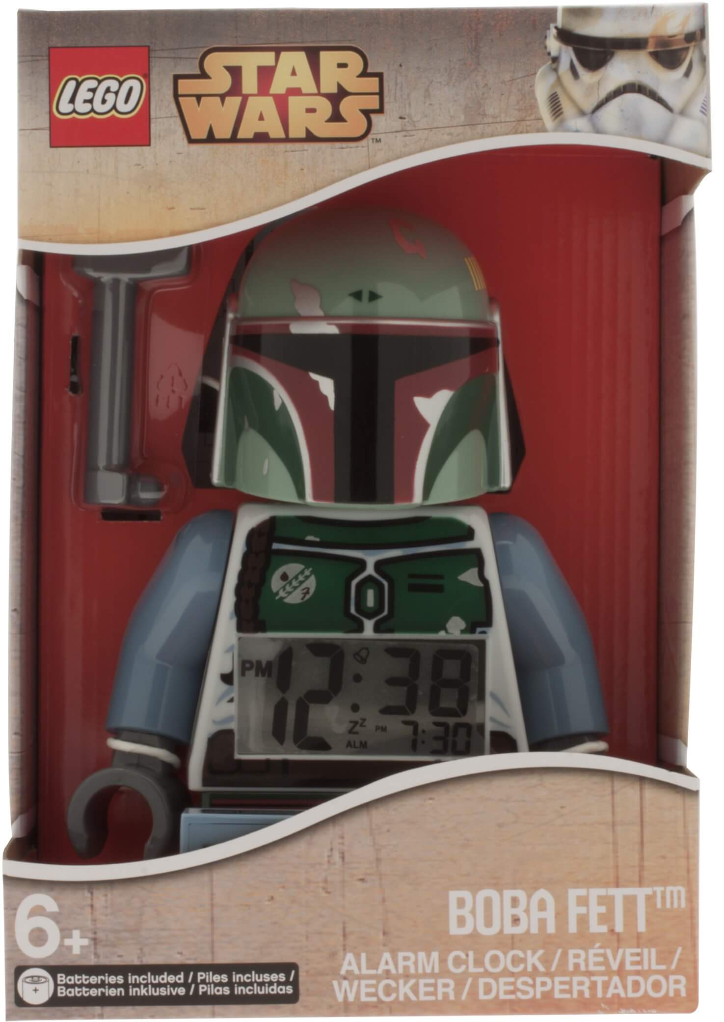 Feel the power of the dark side at home with the LEGO Star Wars Boba Fett Clock. The perfect addition to every LEGO Star Wars collection, this bounty hunter decor features a digital, lighted display and alarm clock. The snooze and backlight functions are activated by pushing down on the minifigures head. A great gift for any LEGO Star Wars fan.