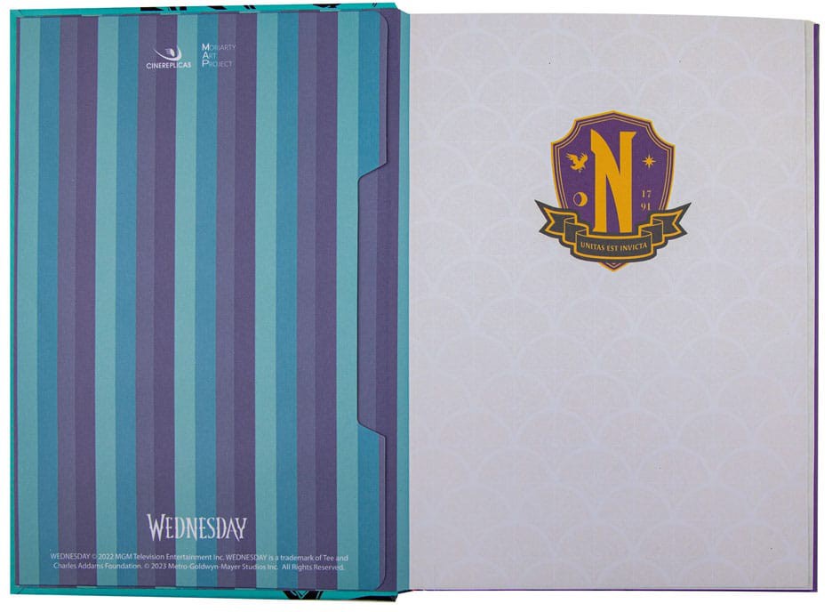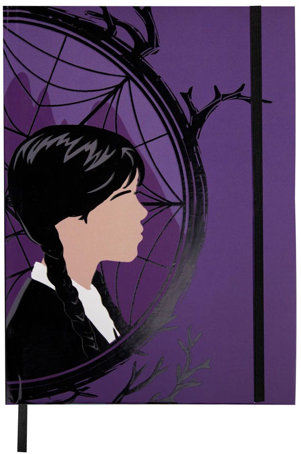 This notebook displays stunning side-profile illustrations of Wednesday and Enid in front of their respective sides of the stained glass window. And that's not all - you'll also find a blue and purple striped pocket at the back to help you store loose bits of paper. The hardcover construction and high-quality paper make it perfect for all your creative needs.