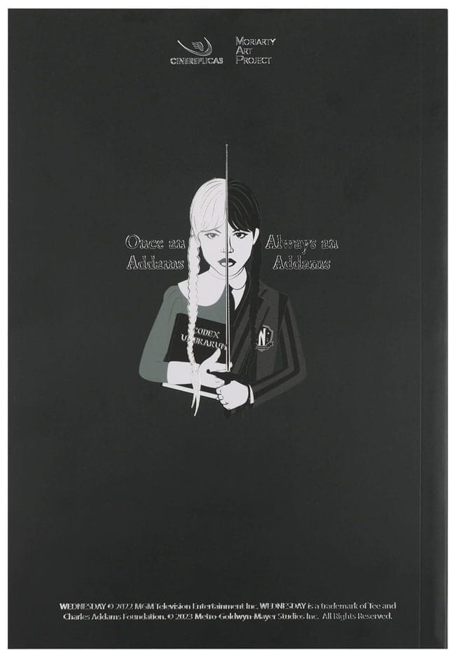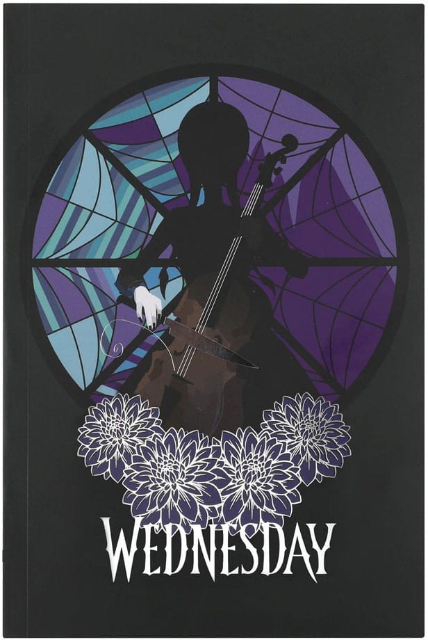 The front cover of the notebook features a captivating image of Wednesday playing the cello with a knife in front of the iconic stained glass window. The softcover design of the notebook makes it easy to carry with you wherever you go, and the high-quality paper ensures that your writing, drawing, or note-taking looks and feels great.