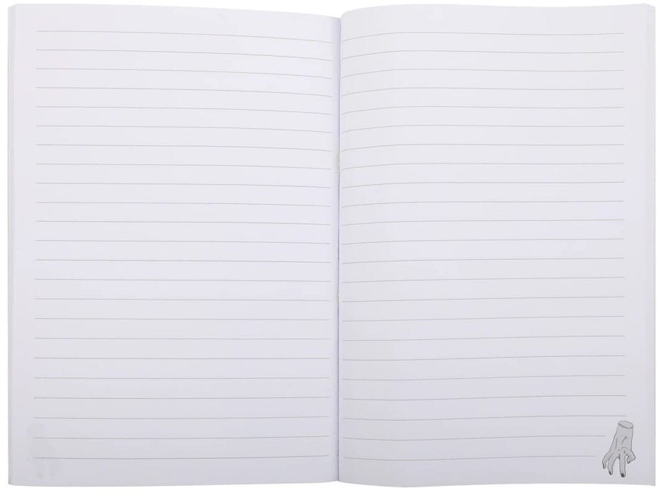 Forsiden af notesbogen har et fængslende billede af Wednesday, der spiller cello med en kniv foran det ikoniske farvede glasvindue. Notesbogens bløde omslag gør den nem at have med overalt, og papiret af høj kvalitet sikrer, at det ser godt ud, når du skriver, tegner eller tager noter.